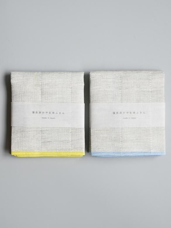 「備長炭かや生地ふきん イエロー」は、まるでリネンのような見た目の薄グレー生地に、鮮やかなイエローのパイピングが効いたセンスの良い一枚。キッチンの風景をぱっと明るく楽しげにしてくれます。