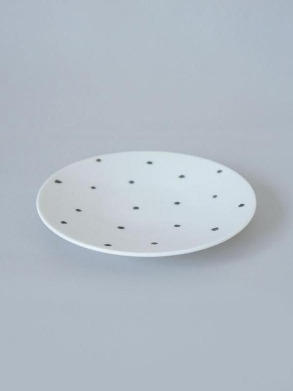 「プレート ドット」は、雨粒のようににじむドット柄の小皿です。直径約14.5cmとケーキやお菓子を出すのにちょうどいいサイズ感と、リムの無いプレーンな形は使い勝手抜群。プレートの端まで絵柄が入り、まるで雑貨やテキスタイルのような佇まいを持っています。