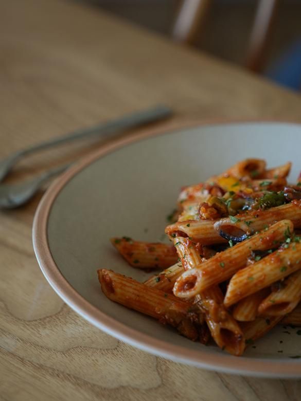 しっかりフチが立ち上がる大きめの皿は、カレーやパスタにちょうど良いサイズ感。