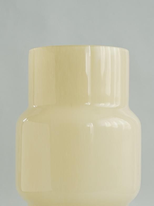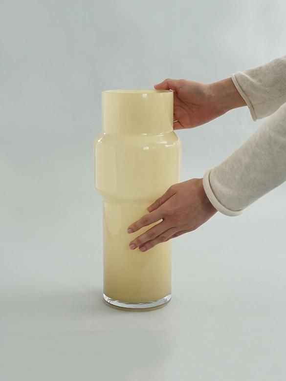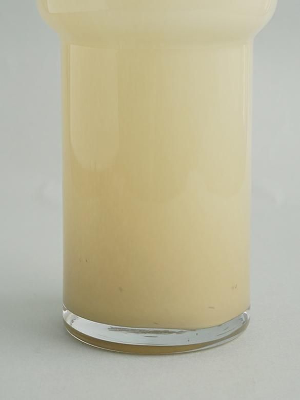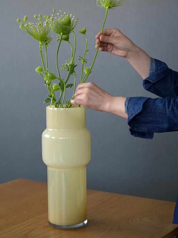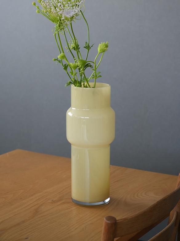 「ミルキーガラスベースM クリーム」は明るく可愛らしいクリームイエローカラー。リビングやサイドボードの上、玄関など広い場所に置いても様になるインパクトを持っています。