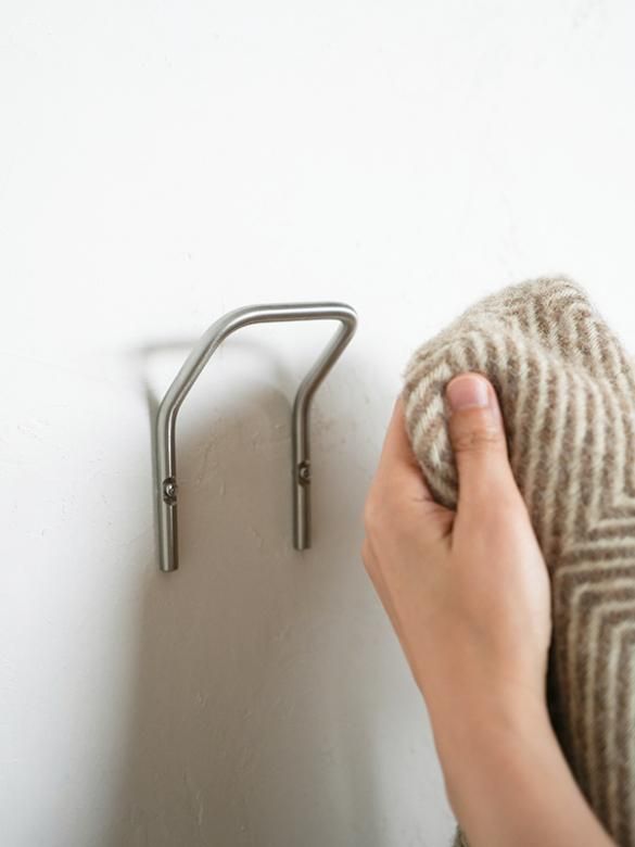 「ren ステンレスUフック ワイド」は、壁にビスで取り付けるU字型フック。ピョコンと壁から立ち上がるフックは、幅広のU字型なので、上着など多少重さのある洋服を掛けてもOK。玄関やリビング、寝室、お手洗いなど色々な場所で活躍します。