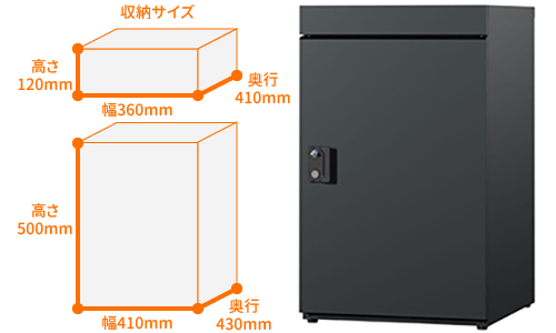 幅41cm高さ50cm奥行43cmの超大型宅配ボックスと3.5cmまでのメール便が受け取り可能なポストの組み合わせ。