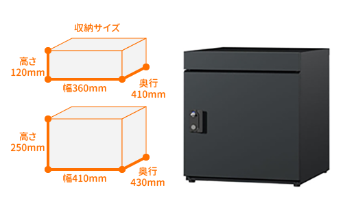 幅41cm高さ25cm奥行43cmの宅配ボックスと3.5cmまでのメール便が受け取り可能なポストの組み合わせです。