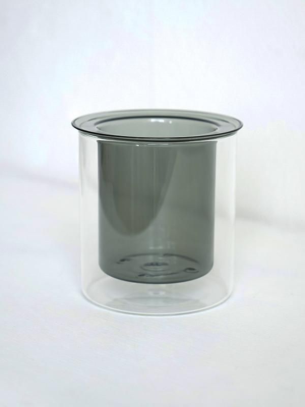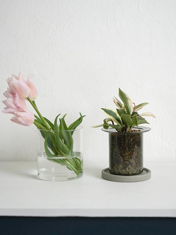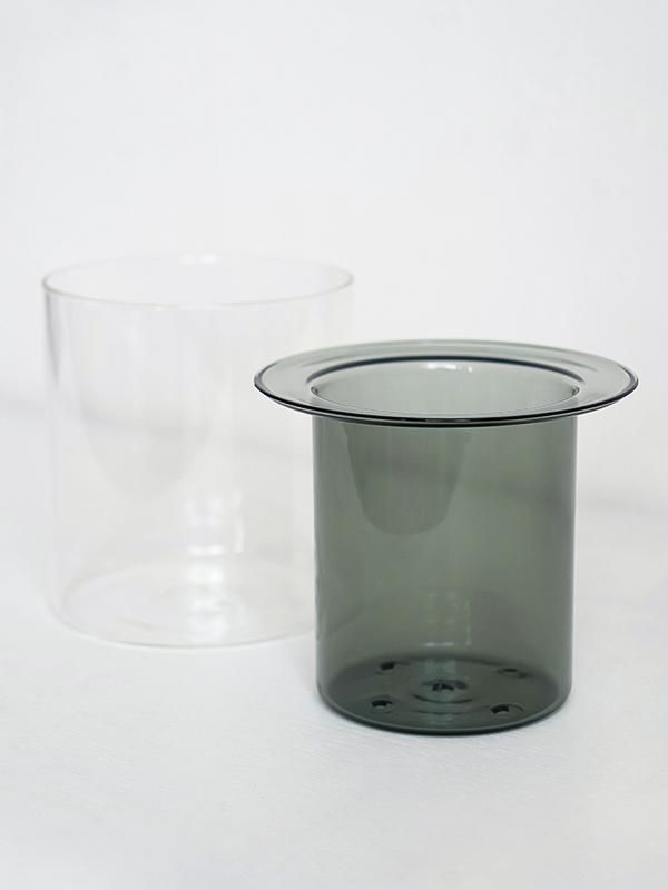 アウターベースはクリアガラス製の円筒形ベース。お花や枝物を飾っても良し、球根物を育てても良しのシンプルな形です。